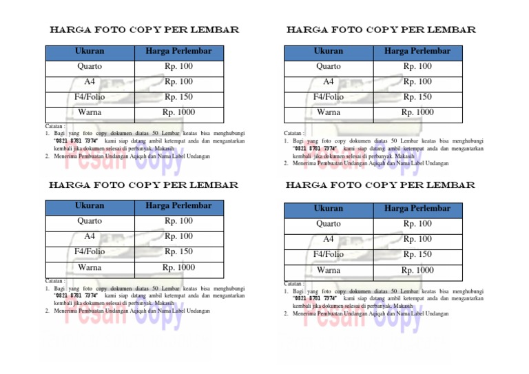 Harga cetak foto sewaktu waktu dapat berubah mengikuti harga pasaran yang meliputi pengaruh perubahan bahan cetak termasuk tinta, kertas dan pemakaian daya listrik. Tebal maksimum per buku adalah 1.200 halaman. Hanya berlaku khusus sekitar daerah kecamatan salam sampai muntilan ongkos delivery. Lihat juga ukuran kertas hvs disini. Soal harga sendiri samsung nampaknya memang memiliki nominal tersendiri yang dimana harga yang ditawarkan sesuai dengan kualitasnya. Daftar harga fotocopy hitam putih perlembar kami memakai mesin digital yang kecepa tannya 50 lembar /menit, dan mesin ini pun sudah di lengkapi dengan system multifungtion. Print hitam putih hvs 80 gsm rp 2.000. Inilah yang anda cari tentang daftar harga fotocopy warna per lembar. Print hitam putih / warna (wordart) harga tidak termasuk print gambar hitam putih atau warna. Print warna (color) hvs 80 gsm rp 3.000. Mari memahami jenis mesin fotocopy sebelum membeli pusat fotokopi. Untuk info lebih lanjut silahkan hubungi : Tebal maksimum per buku menggunakan art paper adalah 1.000 halaman.
