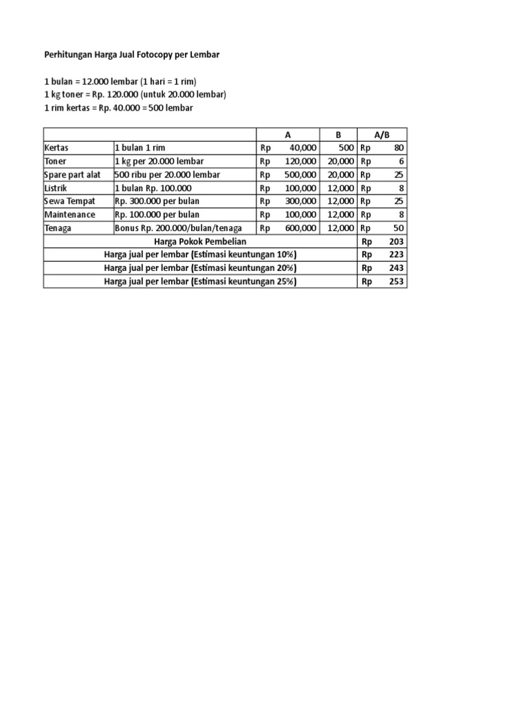Harga tersebut diatas untuk perlembarnya. Bintara foto copy daftar harga fotocopy hitam putih perlembar. Harga print kalkir hitam putih a1, harga print kalkir hitam putih a2, harga print perlembar, harga print warna a0, harga print warna a1, harga print warna a2, harga printing perlembar,. Untuk berapa harga fotocopy per lembar yang sepantasnya guna mengejar modal mesin agar cepat kembali silahkan anda tetapkan sendiri, mungkin rp.200/lembar, harga mesin tidak saya masukkan kedalam faktor penentu harga perlembar karena ia bukanlah faktor yang mempengaruhi dikarenakan mesin fotocopy adalah aset. Lihat juga ukuran kertas hvs disini.